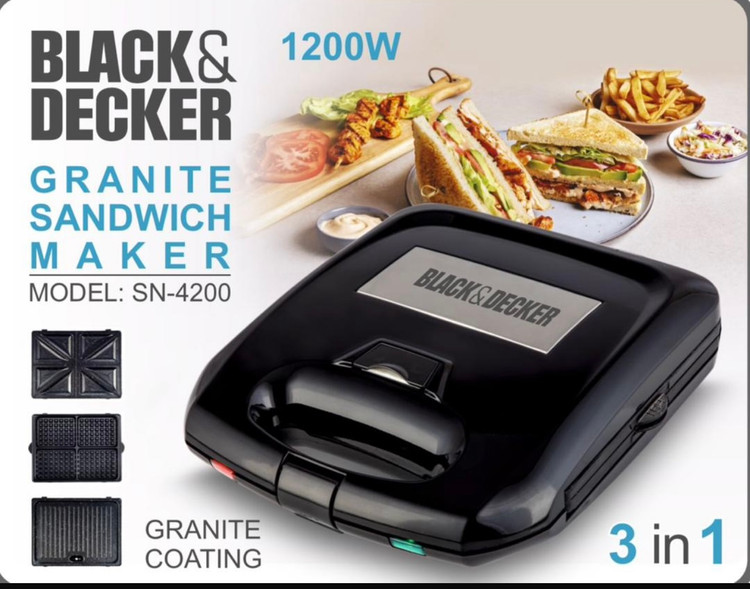 - خرید ساندویچساز بلک اند دکر مدل SN-4200 با ۳ صفحه گرانیتی نسوز، عملکرد گریل، وافلساز و طراحی استیل مشکی – انتخابی هوشمندانه برای آشپزخانههای مدرن.